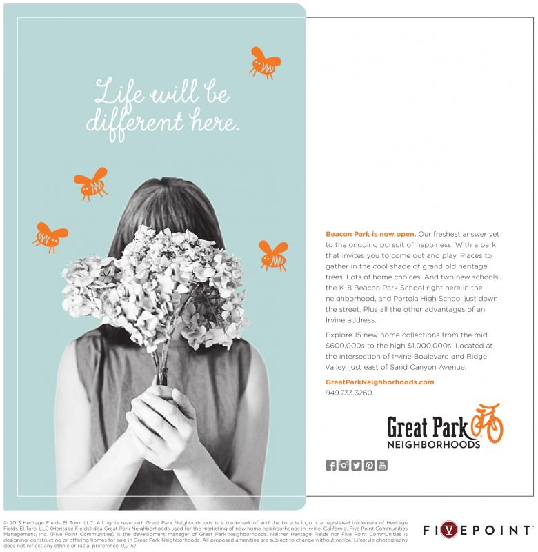 © 2013 Heritage Fields El Toro, LLC. All rights reserved. Great Park Neighborhoods is a trademark of and the bicycle logo is a registered trademark of Heritage Fields El Toro, LLC (Heritage Fields) dba Great Park Neighborhoods used for the marketing of new home neighborhoods in Irvine, California. Five Point Communities Management, Inc. (Five Point Communities) is the development manager of Great Park Neighborhoods. Neither Heritage Fields nor Five Point Communities is designing, constructing or offering homes for sale in Great Park Neighborhoods. All proposed amenities are subject to change without notice. Lifestyle photography does not reflect any ethnic or racial preference. (9/15)
