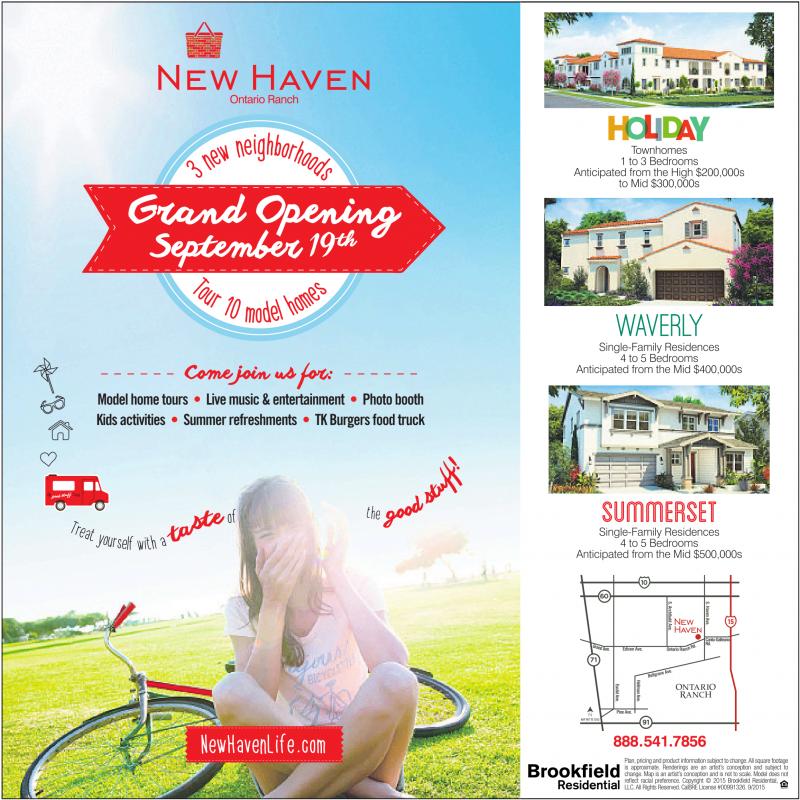 Ontario Ranch Grand Opening Come join us for: Model hometours • Live music &entertainment • Photo booth Kids activities • Summer refreshments • TK Burgers food truck NewHavenLife.com Townhomes 1 to 3 Bedrooms Anticipated from the High $200,000s to Mid $300,000s Single-Family Residences 4 to 5 Bedrooms Anticipated from the Mid $400,000s Single-Family Residences 4 to 5 Bedrooms Anticipated from the Mid $500,000s 10 60 15 Ave. Ontario Ran 71 Edison Ave. Cantu-Galleano Rd. PineAve. 91 888.541.7856 Plan, pricing and product information subject to change.All square footage is approximate. Renderings are an artist’s conception and subject to change. Mapisanartist’sconception and is not to scale. Model does not reflect racial preference. Copyright ©2015 Brookfield Residential, LLC. All Rights Reserved. CalBRE License #00991326. 9/2015