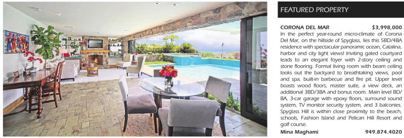 FEATURED PROPERTY CORONA DEL MAR $3,998,000 In the perfect year-round micro-climate of Corona Del Mar, on the hillside of Spyglass, lies this 5BD/4BA residence with spectacular panoramic ocean, Catalina, harbor and city light views! Inviting gated courtyard leads to an elegant foyer with 2-story ceiling and stone flooring. Formal living room with beam ceiling looks out the backyard to breathtaking views, pool and spa, built-in barbecue and fire pit. Upper level boasts wood floors, master suite, a view deck, an additional 3BD/3BA and bonus room. Main level BD/ BA, 3-car garage with epoxy floors, surround sound system, TV monitor security system, and 3 balconies. Spyglass Hill is within close proximity to the beach, schools, Fashion Island and Pelican Hill Resort and golf course. Mina Maghami 949.874.4020