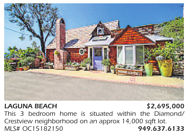 LAGUNA BEACH $2,695,000 This 3 bedroom home is situated within the Diamond/ Crestview neighborhood on an approx 14,000 sqft lot. MLS# OC15182150 949.637.6133