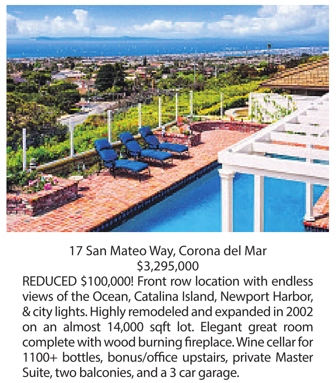 17 San MateoWay, Corona del Mar $3,295,000 REDUCED $100,000! Front row location with endless views of the Ocean, Catalina Island, Newport Harbor, &citylights.Highly remodeled and expanded in 2002 on an almost 14,000 sqft lot. Elegant great room completewith wood burning fireplace.Wine cellar for 1100+ bottles, bonus/office upstairs, private Master Suite, twobalconies,and a3car garage.