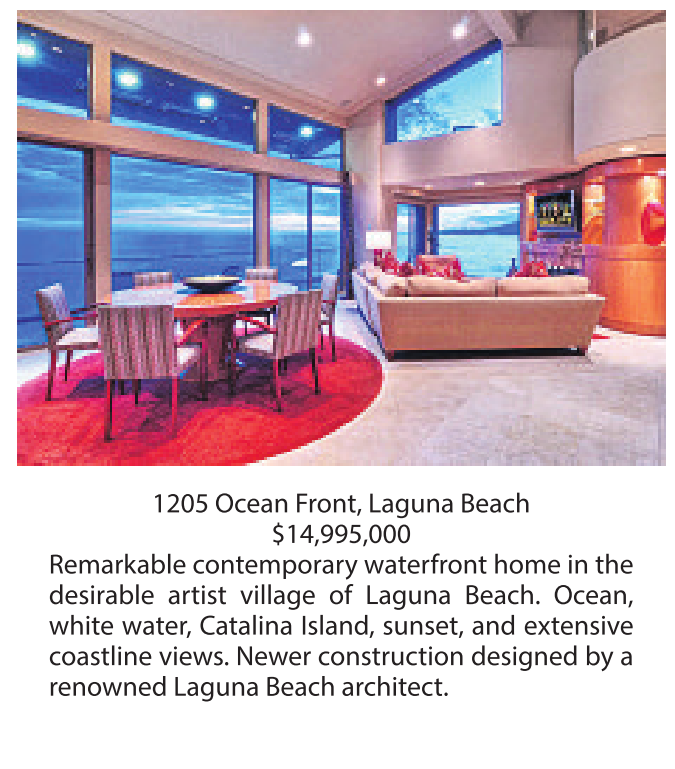1205 Ocean Front, Laguna Beach $14,995,000 Remarkable contemporary waterfront home in the desirable artist village of Laguna Beach. Ocean, white water, Catalina Island, sunset, and extensive coastline views. Newer construction designed by a renowned Laguna Beach architect.