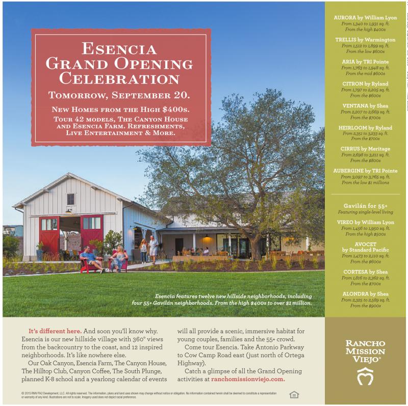 Come tour Esencia. Take Antonio Parkway to Cow Camp Road east (just north of Ortega Highway).