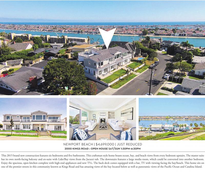 NEWPORT BEACH | $4,699,000 | JUST REDUCED 2000 KINGS ROAD : OPEN HOUSE SAT/SUN 1:30PM-4:30PM This 2015 brand new construction features six bedrooms and five bathrooms. This craftsman style home boasts ocean, bay, and beach views from every bedroom upstairs. The master suite has its own north-facing balcony and en-suite with Lido/Bay views from the Jacuzzi tub. The downstairs features a large media room, which could be converted into another bedroom. Enjoy the spacious, open kitchen complete with high-end appliances and new TVs. The back deck comes equipped with a bar, TV with viewing facing the bay/beach. This home sits on one of the premier streets in this community known as Kings Road and has amazing views of the bay located below as well as panoramic views of the Pacific Ocean and Catalina Island.
