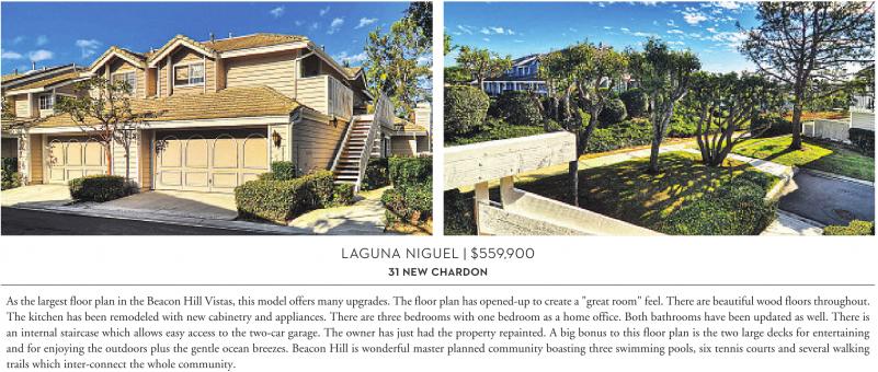 LAGUNA NIGUEL | $559,900 31 NEW CHARDON As the largest floor plan in the Beacon Hill Vistas, this model offers many upgrades. The floor plan has opened-up to create a "great room" feel. There are beautiful wood floors throughout. The kitchen has been remodeled with new cabinetry and appliances. There are three bedrooms with one bedroom as a home office. Both bathrooms have been updated as well. There is an internal staircase which allows easy access to the two-car garage. The owner has just had the property repainted. A big bonus to this floor plan is the two large decks for entertaining and for enjoying the outdoors plus the gentle ocean breezes. Beacon Hill is wonderful master planned community boasting three swimming pools, six tennis courts and several walking trails which inter-connect the whole community.