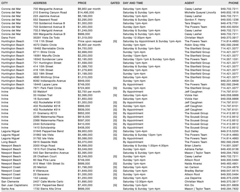 Corona del Mar 700 Marguerite Avenue $6,950 per month Saturday 1pm-4pm Casey Lesher 949.702.7211 Corona del Mar 215 Evening Canyon Road $14,495,000 Saturday & Sunday 1pm-4pm Michelle Queyrel Linovitz 949.632.1618 Corona del Mar 223 Jasmine Avenue $6,199,000 Saturday 1pm-4pm Casey Lesher 949.702.7211 Corona del Mar 552 Seaward Road $2,295,000 Saturday & Sunday 2pm-5pm Gordon F. Henry 949.500.1236 Corona del Mar 703 Goldenrod Avenue B $1,350,000 Saturday 1pm-4pm Tara Shapiro 949.478.7781 Corona del Mar 703 Goldenrod Avenue B $1,350,000 Sunday 2pm-5pm The Powers Team 949.400.8254 Corona del Mar 702.5 Marigold Avenue $1,249,000 Saturday & Sunday 1pm-4pm Casey Lesher 949.702.7211 Corona del Mar 330 Marguerite Avenue B $999,000 Saturday & Sunday 1pm-4pm Casey Lesher 949.702.7211 Dana Point 35291 Vista De Todo $1,319,000 Sunday 12:30pm-4pm Christian Wach 949.370.3917 Huntington Beach 118 11th Street Price upon request [G] Saturday by Appointment & Sunday 1pm-4pm The Powers Team 714.814.4663 Huntington Beach 4072 Diablo Circle $5,800 per month Sunday 1pm-4pm Robin Gray-Hite 562.592.2946 Huntington Beach 16482 Barnstable Circle $4,750,000 Saturday & Sunday 1pm-5pm The Stanfield Group 714.421.3377 Huntington Beach 6711 Shire Circle $2,999,000 Sunday 1pm-4pm The Stanfield Group 714.421.3377 Huntington Beach 16381 Maruffa Circle $2,250,000 Sunday 12pm-5pm The Stanfield Group 714.421.3377 Huntington Beach 16342 Sundancer Lane $2,195,000 Saturday 12pm-1pm & Sunday 1pm-5pm The Powers Team 714.357.1031 Huntington Beach 701 Huntington Street $1,599,000 Saturday 1pm-4pm The Stanfield Group 714.421.3377 Huntington Beach 414 15th Street $1,388,700 Saturday & Sunday 1pm-4pm The Stanfield Group 714.421.3377 Huntington Beach 416 10th Street $1,279,900 Saturday 1pm-4pm The Stanfield Group 714.421.3377 Huntington Beach 322 18th Street $1,199,000 Sunday 1pm-4pm The Stanfield Group 714.421.3377 Huntington Beach 4695 Winthrop Drive $1,015,000 Saturday 1pm-4pm The Stanfield Group 714.421.3377 Huntington Beach 8092 Indianapolis Avenue $849,000 Sunday 1pm-4pm Kim Do 949.201.6809 Huntington Beach 16445 Lazare Lane $749,000 By Appointment The Powers Team 562.592.2946 Huntington Beach 7671 Park Field Circle $724,900 [G] Sunday 1pm-4pm The Stanfield Group 714.421.3377 Irvine 53 Waldorf $2,750 per month By Appointment Jeff Caughren 714.797.6151 Irvine 33 Hidden Trail $2,398,000 [G] Saturday 1pm-4pm Vickie Han 949.558.8866 Irvine 16 Suncreek $1,650,000 Saturday 1pm-4pm Vickie Han 949.558.8866 Irvine 402 Rockefeller #103 $1,350,000 [G] By Appointment Jeff Caughren 714.797.6151 Irvine 402 Rockefeller #216 $999,000 [G] Sunday 1pm-4pm Jeff Caughren 714.797.6151 Irvine 402 Rockefeller #314 $839,000 [G] By Appointment Jeff Caughren 714.797.6151 Irvine 21 Gramercy #213 $652,000 [G] By Appointment The Soussé Group 714.412.8512 Irvine 3265 Watermarke Place $618,000 [G] By Appointment The Soussé Group 714.412.8512 Irvine 2368 Watermarke Place $597,000 [G] By Appointment The Soussé Group 714.412.8512 Irvine 2444 Scholarship $410,000 [G] By Appointment The Soussé Group 714.412.8512 Irvine 1410 Scholarship $408,000 [G] By Appointment The Soussé Group 714.412.8512 Laguna Niguel 31645 Peppertree Bend $9,950,000 [G] Saturday 1pm-4pm Suzi Dailey 949.315.5255 Laguna Niguel 31662 Isle Vista $5,488,000 [G] Saturday & Sunday 12pm-1pm The Powers Team 714.814.4663 Laguna Niguel 31782 Isle Vista $5,088,000 [G] By Appointment The Powers Team 714.814.4663 Long Beach 5915 Seaside Walk $3,370,000 By Appointment The Powers Team 562.592.2946 Newport Beach 2000 Kings Road $4,699,000 Saturday & Sunday 1:30pm-4:30pm Brian Liberto 714.931.3287 Newport Beach 1615 Port Charles Place $3,049,000 Sunday 1pm-4pm Adriana Farfan 949.400.9136 Newport Beach 540 San Bernardino Avenue $2,395,000 Saturday & Sunday 1pm-4pm Mason | Taylor Team 949.294.7832 Newport Beach 26 Chatham Court $2,249,000 [G] Sunday 1pm-4pm Casey Lesher 949.702.7211 Newport Beach 60 Sea Pine Lane $749,000 Sunday 1pm-4pm Allison Root 949.300.5484 Newport Beach 815 West 15th Street 5c $699,000 [G] Sunday 1pm-4pm Naida Alvarez 949.463.4901 Newport Coast 20 Menton $1,798,000 [G] Saturday 1pm-4pm Ian Carlson 714.234.4879 Newport Coast 6 Villeneuve $1,649,000 [G] Saturday 1pm-4pm Bradley Barker 949.547.5515 Newport Coast 23 Saraceno $1,335,000 [G] Sunday 1pm-4pm Allison Root 949.300.5484 Newport Coast 142 Lessay $1,250,000 [G] Saturday 1pm-4pm Joe Deperine 949.375.2208 San Clemente 2407 Calle Monte Carlo $1,695,000 Saturday 12:30pm-4pm Christian Wach 949.370.3917 San Juan Capistrano 31541 Peppertree Bend $7,400,000 [G] Saturday 1pm-5pm Kim Do 949.201.6809 Santa Ana 1732 Sierra Alta Drive $699,000 Saturday & Sunday 1pm-4pm Mason | Taylor Team 949.294.7832