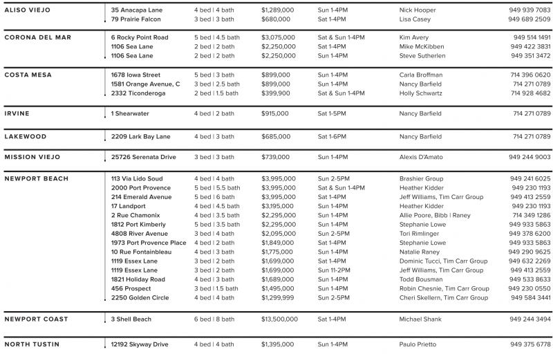 NEWPORT BEACH 113 Via Lido Soud 4 bed | 4 bath $3,995,000 Sun 2-5PM Brashier Group 949 241 6025 2000 Port Provence 5 bed | 5.5 bath $3,995,000 Sat & Sun 1-4PM Heather Kidder 949 230 1193 214 Emerald Avenue 5 bed | 6 bath $3,995,000 Sat 1-4PM Jeff Williams, Tim Carr Group 949 413 2559 17 Landport 4 bed | 4.5 bath $3,195,000 Sun 1-4PM Heather Kidder 949 230 1193 2 Rue Chamonix 4 bed | 3.5 bath $2,295,000 Sun 1-4PM Allie Poore, Bibb | Raney 714 349 1286 1812 Port Kimberly 5 bed | 3.5 bath $2,295,000 Sun 1-4PM Stephanie Lowe 949 933 5863 4808 River Avenue 3 bed | 4 bath $2,095,000 Sun 2-5PM Tori Rimlinger 949 378 6200 1973 Port Provence Place 4 bed | 2 bath $1,849,000 Sat 1-4PM Stephanie Lowe 949 933 5863 10 Rue Fontainbleau 4 bed | 3 bath $1,775,000 Sun 1-4PM Natalie Raney 949 290 9625 1119 Essex Lane 3 bed | 2 bath $1,699,000 Sat 1-4PM Dominic Tucci, Tim Carr Group 949 632 2269 1119 Essex Lane 3 bed | 2 bath $1,699,000 Sun 11-2PM Jeff Williams, Tim Carr Group 949 413 2559 1821 Holiday Road 4 bed | 3 bath $1,689,000 Sun 1-4PM Todd Bousman 949 533 8633 456 Prospect 3 bed | 1.5 bath $1,495,000 Sun 1-4PM Robin Chesnie, Tim Carr Group 949 230 0550 2250 Golden Circle 4 bed | 4 bath $1,299,999 Sun 2-5PM Cheri Skellern, Tim Carr Group 949 584 3441