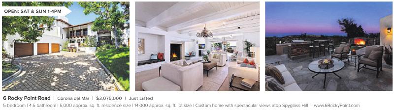 OPEN: SAT & SUN 1-4PM 6 Rocky Point Road | Corona del Mar | $3,075,000 | Just Listed 5 bedroom | 4.5 bathroom | 5,000 approx. sq. ft. residence size | 14,000 approx. sq. ft. lot size | Custom home with spectacular views atop Spyglass Hill | www.6RockyPoint.com See also