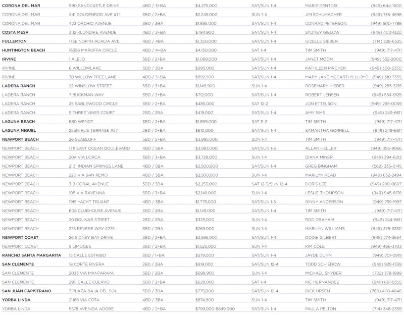 IRVINE 38 WILLOW TREE LANE 4BD / 3+BA $892,500 SAT/SUN 1-4 MARY JANE MCCARTHY-LLOYD (949) 310-7355 LADERA RANCH 22 WINSLOW STREET 5BD / 3+BA $1,149,900 SUN 1-4 ROSEMARY HIEBER (949) 285-3215 LADERA RANCH 7 BUCKMAN WAY 3BD / 2+BA $712,000 SAT/SUN 1-4 ROBERT JENSEN (949) 554-9125 LADERA RANCH 25 SABLEWOOD CIRCLE 3BD / 2+BA $485,000 SAT 12-2 JON ETTELSON (949) 295-0059 LADERA RANCH 9 THREE VINES COURT 2BD / 2BA $419,000 SAT/SUN 1-4 AMY SIMS (949) 249-6611 LAGUNA BEACH 680 WENDT 3BD / 2+BA $1,899,000 SAT 11-2 TIM SMITH (949) 717-4711 LAGUNA NIGUEL 25515 RUE TERRASE #27 2BD / 2+BA $610,000 SAT/SUN 1-4 SAMANTHA GORRELL (949) 249-6611 NEWPORT BEACH 26 SEABLUFF 5BD / 5+BA $3,995,000 SUN 1-4 TIM SMITH (949) 717-4711 NEWPORT BEACH 1711 EAST OCEAN BOULEVARD 4BD / 5BA $3,983,000 SAT/SUN 1-6 ALLAN HELLER (949) 395-9966 NEWPORT BEACH 204 VIA LORCA 3BD / 3+BA $3,728,000 SUN 1-4 DIANA MINER (949) 394-6212 NEWPORT BEACH 2101 INDIAN SPRINGS LANE 4BD / 5BA $2,500,000 SAT/SUN 1-4 GREG BINGHAM (562) 335-0145 NEWPORT BEACH 220 VIA SAN REMO 4BD / 3BA $2,500,000 SUN 1-4 MARILYN READ (949) 632-2494 NEWPORT BEACH 319 CORAL AVENUE 3BD / 3BA $2,253,000 SAT 12-3/SUN 12-4 DORIS LEE (949) 280-0607 NEWPORT BEACH 105 VIA RAVENNA 3BD / 3+BA $2,149,000 SUN 1-4 LESLIE THOMPSON (949) 945-8176 NEWPORT BEACH 1915 YACHT TRUANT 4BD / 3BA $1,775,000 SAT/SUN 1-5 GINNY ANDERSON (949) 759-1997 NEWPORT BEACH 608 CLUBHOUSE AVENUE 3BD / 2BA $1,149,000 SAT/SUN 1-4 TIM SMITH (949) 717-4711 NEWPORT BEACH 20 BOLIVAR STREET 2BD / 2BA $325,000 SUN 1-4 ROD GRAHAM (949) 244-8611 NEWPORT BEACH 275 REVERE WAY #275 3BD / 2BA $269,000 SUN 1-4 MARILYN WILLIAMS (949) 378-3330 NEWPORT COAST 26 SIDNEY BAY DRIVE 3BD / 2+BA $2,595,000 SAT/SUN 1-4 DODIE GILBERT (949) 274-3654 NEWPORT COAST 9 LIMOGES 3BD / 2+BA $1,525,000 SUN 1-4 KIM COLE (949) 466-3703 RANCHO SANTA MARGARITA 15 CALLE ESTRIBO 3BD / 1+BA $579,000 SAT/SUN 1-4 JAYDE DUNN (949) 701-0919 SAN CLEMENTE 18 CORTE RIVERA 2BD / 2BA $919,000 SAT/SUN 12-4 TODD SCHIEDOW (949) 929-1339 SAN CLEMENTE 2033 VIA MANTARAYA 3BD / 2BA $699,900 SUN 1-4 MICHAEL SNYDER (702) 378-1999 SAN CLEMENTE 290 CALLE CUERVO 3BD / 2+BA $629,000 SAT 1-4 RIC HERNANDEZ (949) 661-9355 SAN JUAN CAPISTRANO 7 PLAZA BAJA DEL SOL 3BD / 3BA $775,000 SAT/SUN 12-4 RICK URSEM (760) 408-4846 YORBA LINDA 21166 VIA COTA 4BD / 3BA $874,900 SUN 1-4 TIM SMITH (949) 717-4711 YORBA LINDA 5578 AVENIDA ADOBE 4BD / 2+BA $799,000-$849,000 SAT/SUN 1-4 PAULA PELTON (714) 348-2359