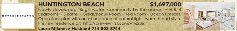 HUNTINGTON BEACH $1,697,000 Newly developed ‘Brightwater’ community by the ocean ~ H.B. 4 Bedrooms ~ 5 Baths ~ Great/Bonus Room ~ Tea Room~ Ocean Breezes. Open floor plan with an abundance of natural light, warmth and style. Preview residence at: http://previewfirst.com/vt/62361 Laura Milanese-Husband 714-803-8744