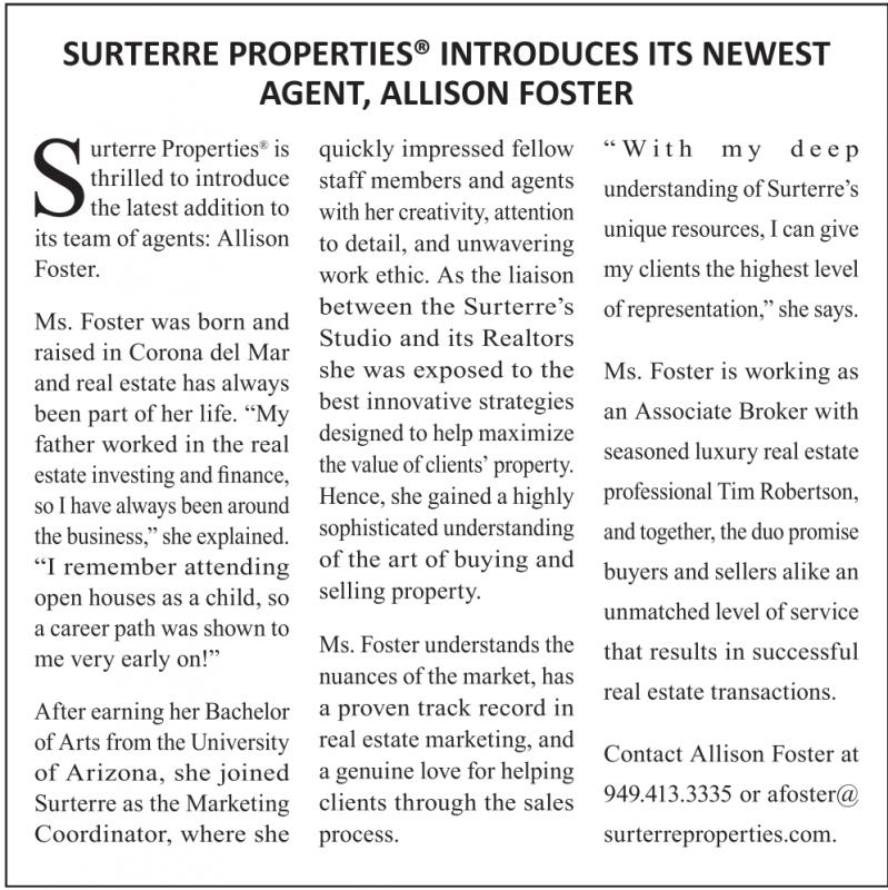 SURTERRE PROPERTIES® INTRODUCES ITS NEWEST AGENT, ALLISON FOSTER