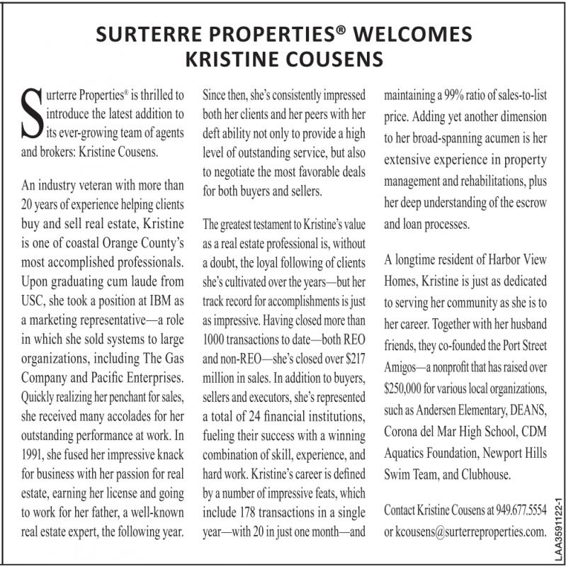 ContactKristineCousens at 949.677.5554 or kcousens@surterreproperties.com.