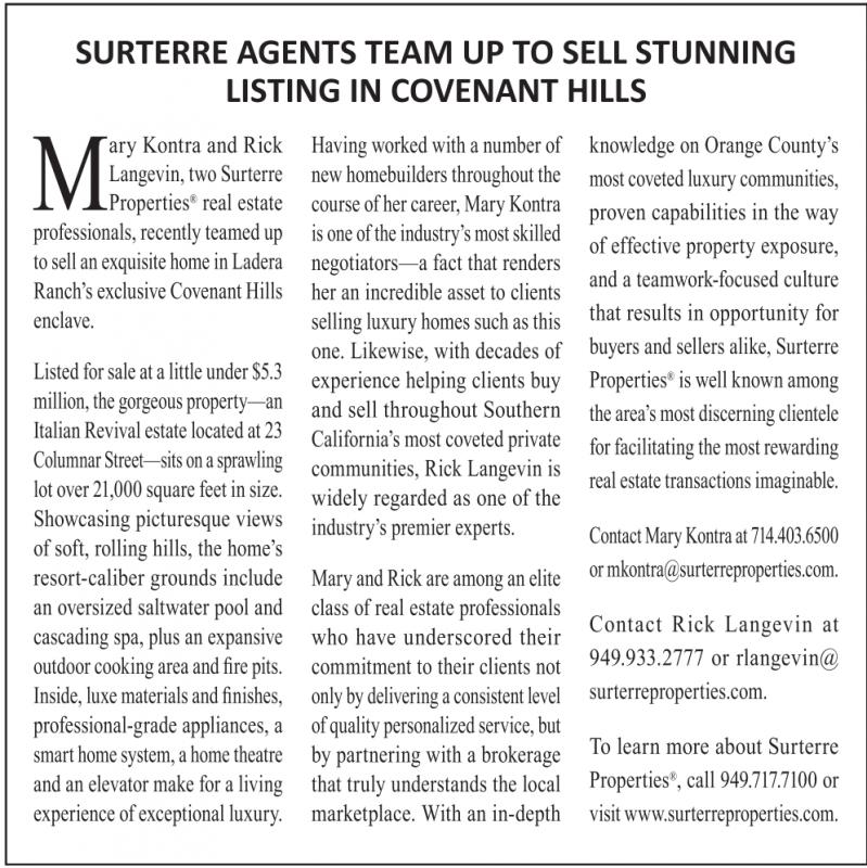 Kontra and Rick Langevin,two Surterre Properties ® real estate professionals, recently teamed up to sell an exquisitehome in Ladera Ranch’s exclusiveCovenant Hills enclave.