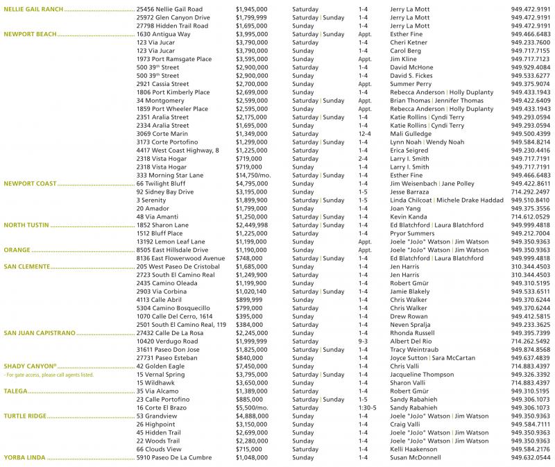 NELLIE GAIL RANCH......................................... 25456 Nellie Gail Road $1,945,000 Saturday 1-4 Jerry La Mott 949.472.9191 25972 Glen Canyon Drive $1,799,999 Saturday | Sunday 1-4 Jerry La Mott 949.472.9191 27798 Hidden Trail Road $1,695,000 Sunday 1-4 Jerry La Mott 949.472.9191 NEWPORT BEACH............................................. 1630 Antigua Way $3,995,000 Saturday | Sunday Appt. Esther Fine 949.466.6483 123 Via Jucar $3,790,000 Saturday 1-4 Cheri Ketner 949.233.7600 123 Via Jucar $3,790,000 Sunday 1-4 Carol Berg 949.717.7155 1973 Port Ramsgate Place $3,595,000 Sunday Appt. Jim Kline 949.717.7123 500 39 th Street $2,900,000 Saturday 1-4 David McHone 949.929.4084 500 39 th Street $2,900,000 Sunday 1-4 David S. Fickes 949.533.6277 2921 Cassia Street $2,700,000 Sunday Appt. Summer Perry 949.375.9074 1806 Port Kimberly Place $2,699,000 Sunday 1-4 Rebecca Anderson | Holly Duplanty 949.433.1943 34 Montgomery $2,599,000 Saturday | Sunday Appt. Brian Thomas | Jennifer Thomas 949.422.6409 1859 Port Wheeler Place $2,595,000 Sunday Appt. Rebecca Anderson | Holly Duplanty 949.433.1943 2351 Aralia Street $2,175,000 Saturday | Sunday 1-4 Katie Rollins | Cyndi Terry 949.293.0594 2334 Aralia Street $1,695,000 Sunday 1-4 Katie Rollins | Cyndi Terry 949.293.0594 3069 Corte Marin $1,349,000 Saturday 12-4 Mali Gulledge 949.500.4399 3173 Corte Portofino $1,299,000 Saturday | Sunday 1-4 Lynn Noah | Wendy Noah 949.584.8214 4417 West Coast Highway, 8 $1,225,000 Saturday 1-4 Erica Seigred 949.230.4416 2318 Vista Hogar $719,000 Saturday 2-4 Larry I. Smith 949.717.7191 2318 Vista Hogar $719,000 Sunday 1-4 Larry I. Smith 949.717.7191 333 Morning Star Lane $14,750/mo. Saturday | Sunday 1-4 Esther Fine 949.466.6483 NEWPORT COAST............................................. 66 Twilight Bluff $4,795,000 Sunday 1-4 Jim Weisenbach | Jane Polley 949.422.8611 92 Sidney Bay Drive $3,195,000 Sunday 1-5 Jesse Barraza 714.292.2497 3 Serenity $1,899,900 Saturday | Sunday 1-5 Linda Chilcoat | Michele Drake Haddad 949.510.8410 20 Amador $1,799,000 Sunday 1-4 Joan Yang 949.375.3556 48 Via Amanti $1,250,000 Saturday | Sunday 1-4 Kevin Kanda 714.612.0529 NORTH TUSTIN ................................................. 1852 Sharon Lane $2,449,998 Saturday | Sunday 1-4 Ed Blatchford | Laura Blatchford 949.999.4818 1512 Bluff Place $1,225,000 Saturday 1-4 Pryor Summers 949.212.7004 13192 Lemon Leaf Lane $1,199,000 Sunday Appt. Joele "JoJo" Watson | Jim Watson 949.350.9363 ORANGE ............................................................ 8505 East Hillsdale Drive $1,190,000 Sunday Appt. Joele "JoJo" Watson | Jim Watson 949.350.9363 8136 East Flowerwood Avenue $748,000 Saturday | Sunday 1-4 Ed Blatchford | Laura Blatchford 949.999.4818 SAN CLEMENTE................................................. 205 West Paseo De Cristobal $1,685,000 Sunday 1-4 Jen Harris 310.344.4503 2723 South El Camino Real $1,249,900 Saturday 1-4 Jen Harris 310.344.4503 2435 Camino Oleada $1,199,900 Sunday 1-4 Robert Gmür 949.310.5195 2903 Via Corbina $1,020,140 Saturday | Sunday 1-4 Jamie Blakely 949.533.6511 4113 Calle Abril $899,999 Sunday 1-4 Chris Walker 949.370.6244 5304 Camino Bosquecillo $799,000 Saturday 1-4 Chris Walker 949.370.6244 1070 Calle Del Cerro, 1614 $395,000 Sunday 1-4 Drew Rowan 949.412.5815 2501 South El Camino Real, 119 $384,000 Saturday 1-4 Neven Spralja 949.233.3625 SAN JUAN CAPISTRANO.................................. 27432 Calle De La Rosa $2,245,000 Sunday 1-4 Rhonda Russell 949.395.7399 10420 Verdugo Road $1,999,999 Saturday 9-3 Albert Del Rio 714.262.5492 31611 Paseo Don Jose $1,825,000 Saturday | Sunday 1-4 Tracy Weintraub 949.874.8568 27731 Paseo Esteban $840,000 Sunday 1-4 Joyce Sutton | Sara McCartan 949.637.4839 SHADY CANYON ® ............................................. 42 Golden Eagle $7,450,000 Sunday 1-4 Chris Valli 714.883.4397 -For gate access,pleasecallagentslisted. 15 Vernal Spring $3,795,000 Saturday | Sunday 1-4 Jacqueline Thompson 949.326.3392 15 Wildhawk $3,650,000 Sunday 1-4 Sharon Valli 714.883.4397 TALEGA.............................................................. 35 Via Alcamo $1,389,000 Saturday 1-4 Robert Gmür 949.310.5195 23 Calle Portofino $885,000 Saturday | Sunday 1-5 Sandy Rabahieh 949.306.1073 16 Corte El Brazo $5,500/mo. Saturday 1:30-5 Sandy Rabahieh 949.306.1073 TURTLE RIDGE................................................... 53 Grandview $4,888,000 Sunday 1-4 Joele "JoJo" Watson | Jim Watson 949.350.9363 26 Highpoint $3,150,000 Sunday 1-4 Craig Valli 949.584.7111 45 Hidden Trail $2,699,000 Sunday 1-4 Joele "JoJo" Watson | Jim Watson 949.350.9363 22 Woods Trail $2,280,000 Sunday 1-4 Joele "JoJo" Watson | Jim Watson 949.350.9363 66 Clouds View $715,000 Saturday 1-4 Kelli Haakenson 949.584.2176 YORBA LINDA ................................................... 5910 Paseo De La Cumbre $1,048,000 Sunday 1-4 Susan McDonnell 949.632.0544