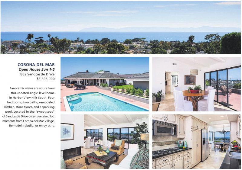 CORONA DEL MAR Open House Sun 1-5 882 Sandcastle Drive $3,395,000 Panoramic views are yours from this updated single-level home in Harbor View Hills South. Four bedrooms, two baths, remodeled kitchen, stone floors, and a sparkling pool. Located in the “sweet spot” of Sandcastle Driveonanoversizedlot, momentsfromCoronadel MarVillage. Remodel, rebuild, or enjoy as-is. See also