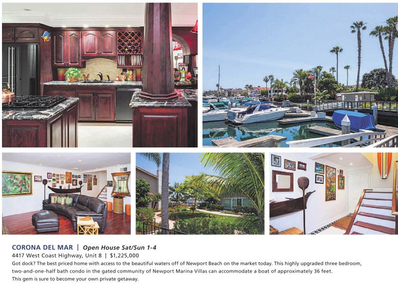 CORONA DEL MAR | Open House Sat/Sun 1-4 4417 West Coast Highway, Unit 8 | $1,225,000 Got dock? The best priced home with access to the beautiful waters off of Newport Beach on the market today. This highly upgraded three bedroom, two-and-one-half bath condo in the gated community of Newport Marina Villas can accommodate a boat of approximately 36 feet. This gem is sure to become your own private getaway. See also