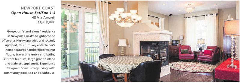 NEWPORT COAST Open House Sat/Sun 1-4 48 Via Amanti $1,250,000 Gorgeous “stand alone” residence in Newport Coast’s neighborhood of Verona. Highlyupgradedand recently updated, this turn-key entertainer’s home features handscraped walnut floors, travertine entry and baths, custom built-ins, large granite island and stainless appliances. Experience Newport Coast luxury living with community pool, spa and clubhouse. See also