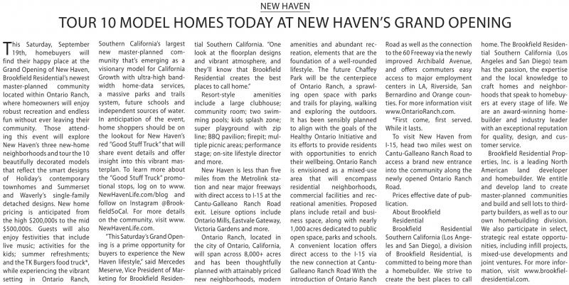 Saturday, September 19th, homebuyers will find their happy place at the Grand Opening of New Haven, Brookfield Residential’s newest master-planned community located within Ontario Ranch, where homeowners will enjoy robust recreation and endless fun without ever leaving their community. Those attending this event will explore New Haven’s three new-home neighborhoods and tour the 10 beautifully decorated models that reflect the smart designs of Holiday’s contemporary townhomes and Summerset and Waverly’s single-family detached designs. New home pricing is anticipated from the high $200,000s to the mid $500,000s. Guests will also enjoy festivities that include live music; activities for the kids; summer refreshments; and the TK Burgers food truck*, while experiencing the vibrant setting in Ontario Ranch,