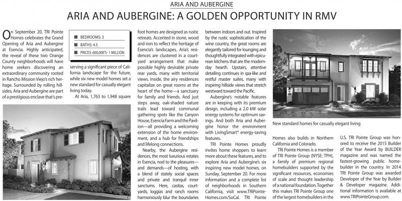 TRI Pointe Homes proudly invites home shoppers to learn moreabout these features,and to explore Aria and Aubergine’s six inspiring new model homes, on Sunday, September 20. For more information and a complete list of neighborhoods in Southern California, visit www.TRIPointe- Homes.com/SoCal. TRI Pointe