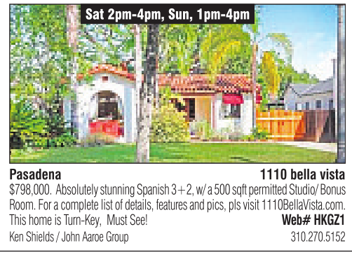 Sat 2pm-4pm, Sun, 1pm-4pm Pasadena 1110 bella vista $798,000. Absolutely stunning Spanish3+2, w/ a500 sqft permitted Studio/ Bonus Room. For acomplete list of details,features and pics,pls visit 1110BellaVista.com. This home is Turn-Key, MustSee! Web# HKGZ1 KenShields /John Aaroe Group 310.270.5152