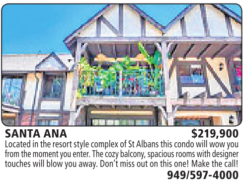 SANTA ANA $219,900 Located in theresortstyle complexofStAlbansthis condowill wow you from themoment youenter.The cozy balcony,spaciousroomswithdesigner toucheswill blow youaway.Don’t missout on this one!Makethe call!