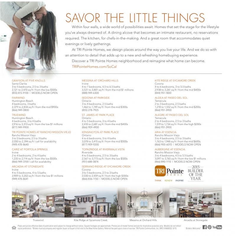 Plansand prices effectivedate of publicationand subject to change withoutnotice.Squarefootages areapproximate. Photos are of model homesand arefor illustrativepurposesonly. Modelsdonot reflect racial preference. *Brokermustaccompanyand register buyer on buyer’s firstvisit to the NewHomeGallery.Referral feepaiduponclose of escrow.TRI Pointe Communities, Inc. BRE 01888935.9/15