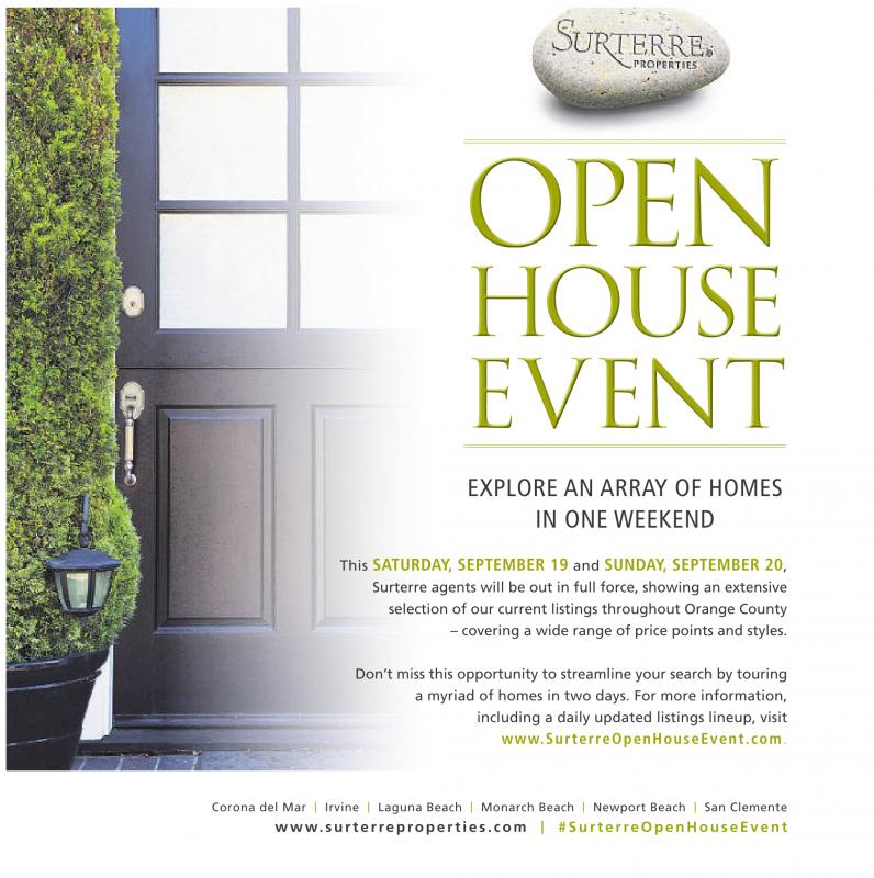 EXPLORE AN ARRAY OF HOMES IN ONE WEEKEND This SATURDAY, SEPTEMBER 19 and SUNDAY, SEPTEMBER 20, Surterre agents will be out in full force, showing an extensive selection of our current listings throughout Orange County – covering a wide range of price points and styles. Don’t miss this opportunity to streamline your search by touring a myriad of homes in two days. For more information, including a daily updated listings lineup, visit www.SurterreOpenHouseEvent.com. Corona del Mar | Irvine | Laguna Beach | Monarch Beach | Newport Beach | San Clemente www.surterreproperties.com | #SurterreOpenHouseEvent