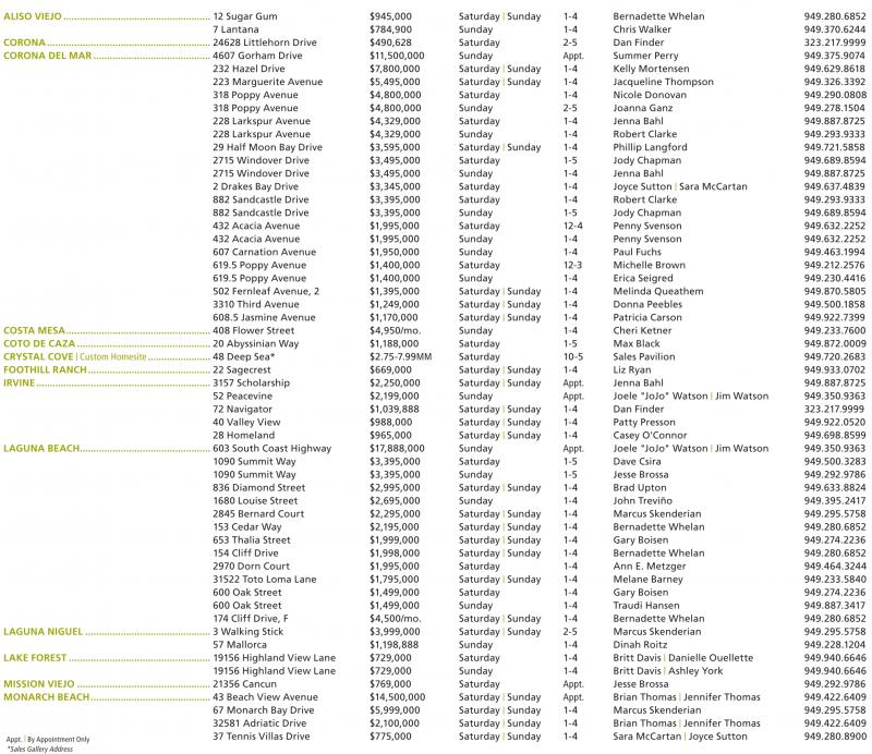 ALISO VIEJO ...................................................... 12 Sugar Gum $945,000 Saturday | Sunday 1-4 Bernadette Whelan 949.280.6852 7 Lantana $784,900 Sunday 1-4 Chris Walker 949.370.6244 CORONA............................................................ 24628 Littlehorn Drive $490,628 Saturday 2-5 Dan Finder 323.217.9999 CORONA DEL MAR ........................................... 4607 Gorham Drive $11,500,000 Sunday Appt. Summer Perry 949.375.9074 232 Hazel Drive $7,800,000 Saturday | Sunday 1-4 Kelly Mortensen 949.629.8618 223 Marguerite Avenue $5,495,000 Saturday | Sunday 1-4 Jacqueline Thompson 949.326.3392 318 Poppy Avenue $4,800,000 Saturday 1-4 Nicole Donovan 949.290.0808 318 Poppy Avenue $4,800,000 Sunday 2-5 Joanna Ganz 949.278.1504 228 Larkspur Avenue $4,329,000 Saturday 1-4 Jenna Bahl 949.887.8725 228 Larkspur Avenue $4,329,000 Sunday 1-4 Robert Clarke 949.293.9333 29 Half Moon Bay Drive $3,595,000 Saturday | Sunday 1-4 Phillip Langford 949.721.5858 2715 Windover Drive $3,495,000 Saturday 1-5 Jody Chapman 949.689.8594 2715 Windover Drive $3,495,000 Sunday 1-4 Jenna Bahl 949.887.8725 2 Drakes Bay Drive $3,345,000 Saturday 1-4 Joyce Sutton | Sara McCartan 949.637.4839 882 Sandcastle Drive $3,395,000 Saturday 1-4 Robert Clarke 949.293.9333 882 Sandcastle Drive $3,395,000 Sunday 1-5 Jody Chapman 949.689.8594 432 Acacia Avenue $1,995,000 Saturday 12-4 Penny Svenson 949.632.2252 432 Acacia Avenue $1,995,000 Sunday 1-4 Penny Svenson 949.632.2252 607 Carnation Avenue $1,950,000 Sunday 1-4 Paul Fuchs 949.463.1994 619.5 Poppy Avenue $1,400,000 Saturday 12-3 Michelle Brown 949.212.2576 619.5 Poppy Avenue $1,400,000 Sunday 1-4 Erica Seigred 949.230.4416 502 Fernleaf Avenue, 2 $1,395,000 Saturday | Sunday 1-4 Melinda Queathem 949.870.5805 3310 Third Avenue $1,249,000 Saturday | Sunday 1-4 Donna Peebles 949.500.1858 608.5 Jasmine Avenue $1,170,000 Saturday | Sunday 1-4 Patricia Carson 949.922.7399 COSTA MESA..................................................... 408 Flower Street $4,950/mo. Sunday 1-4 Cheri Ketner 949.233.7600 COTO DE CAZA ................................................. 20 Abyssinian Way $1,188,000 Saturday 1-5 Max Black 949.872.0009 CRYSTAL COVE | Custom Homesite....................... 48 Deep Sea* $2.75-7.99MM Saturday 10-5 Sales Pavilion 949.720.2683 FOOTHILL RANCH............................................. 22 Sagecrest $669,000 Saturday | Sunday 1-4 Liz Ryan 949.933.0702 IRVINE................................................................ 3157 Scholarship $2,250,000 Saturday | Sunday Appt. Jenna Bahl 949.887.8725 52 Peacevine $2,199,000 Sunday Appt. Joele "JoJo" Watson | Jim Watson 949.350.9363 72 Navigator $1,039,888 Saturday | Sunday 1-4 Dan Finder 323.217.9999 40 Valley View $988,000 Saturday | Sunday 1-4 Patty Presson 949.922.0520 28 Homeland $965,000 Saturday | Sunday 1-4 Casey O'Connor 949.698.8599 LAGUNA BEACH................................................ 603 South Coast Highway $17,888,000 Sunday Appt. Joele "JoJo" Watson | Jim Watson 949.350.9363 1090 Summit Way $3,395,000 Saturday 1-5 Dave Csira 949.500.3283 1090 Summit Way $3,395,000 Sunday 1-5 Jesse Brossa 949.292.9786 836 Diamond Street $2,995,000 Saturday | Sunday 1-4 Brad Upton 949.633.8824 1680 Louise Street $2,695,000 Sunday 1-4 John Treviño 949.395.2417 2845 Bernard Court $2,295,000 Saturday | Sunday 1-4 Marcus Skenderian 949.295.5758 153 Cedar Way $2,195,000 Saturday | Sunday 1-4 Bernadette Whelan 949.280.6852 653 Thalia Street $1,999,000 Saturday | Sunday 1-4 Gary Boisen 949.274.2236 154 Cliff Drive $1,998,000 Saturday | Sunday 1-4 Bernadette Whelan 949.280.6852 2970 Dorn Court $1,995,000 Saturday 1-4 Ann E. Metzger 949.464.3244 31522 Toto Loma Lane $1,795,000 Saturday | Sunday 1-4 Melane Barney 949.233.5840 600 Oak Street $1,499,000 Saturday 1-4 Gary Boisen 949.274.2236 600 Oak Street $1,499,000 Sunday 1-4 Traudi Hansen 949.887.3417 174 Cliff Drive, F $4,500/mo. Saturday | Sunday 1-4 Bernadette Whelan 949.280.6852 LAGUNA NIGUEL.............................................. 3 Walking Stick $3,999,000 Saturday | Sunday 2-5 Marcus Skenderian 949.295.5758 57 Mallorca $1,198,888 Sunday 1-4 Dinah Roitz 949.228.1204 LAKE FOREST.................................................... 19156 Highland View Lane $729,000 Saturday 1-4 Britt Davis | Danielle Ouellette 949.940.6646 19156 Highland View Lane $729,000 Sunday 1-4 Britt Davis | Ashley York 949.940.6646 MISSION VIEJO ................................................. 21356 Cancun $769,000 Saturday Appt. Jesse Brossa 949.292.9786 MONARCH BEACH............................................ 43 Beach View Avenue $14,500,000 Saturday | Sunday Appt. Brian Thomas | Jennifer Thomas 949.422.6409 67 Monarch Bay Drive $5,999,000 Saturday | Sunday 1-4 Marcus Skenderian 949.295.5758 32581 Adriatic Drive $2,100,000 Saturday | Sunday 1-4 Brian Thomas | Jennifer Thomas 949.422.6409 Appt. | By AppointmentOnly 37 Tennis Villas Drive $775,000 Saturday | Sunday 1-4 Sara McCartan | Joyce Sutton 949.280.8900 *Sales GalleryAddress