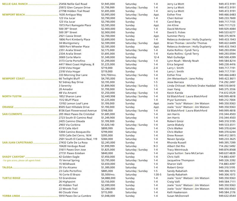 NELLIE GAIL RANCH......................................... 25456 Nellie Gail Road $1,945,000 Saturday 1-4 Jerry La Mott 949.472.9191 25972 Glen Canyon Drive $1,799,999 Saturday | Sunday 1-4 Jerry La Mott 949.472.9191 27798 Hidden Trail Road $1,695,000 Sunday 1-4 Jerry La Mott 949.472.9191 NEWPORT BEACH............................................. 1630 Antigua Way $3,995,000 Saturday | Sunday Appt. Esther Fine 949.466.6483 123 Via Jucar $3,790,000 Saturday 1-4 Cheri Ketner 949.233.7600 123 Via Jucar $3,790,000 Sunday 1-4 Carol Berg 949.717.7155 1973 Port Ramsgate Place $3,595,000 Sunday Appt. Jim Kline 949.717.7123 500 39 th Street $2,900,000 Saturday 1-4 David McHone 949.929.4084 500 39 th Street $2,900,000 Sunday 1-4 David S. Fickes 949.533.6277 2921 Cassia Street $2,700,000 Sunday Appt. Summer Perry 949.375.9074 1806 Port Kimberly Place $2,699,000 Sunday 1-4 Rebecca Anderson | Holly Duplanty 949.433.1943 34 Montgomery $2,599,000 Saturday | Sunday Appt. Brian Thomas | Jennifer Thomas 949.422.6409 1859 Port Wheeler Place $2,595,000 Sunday Appt. Rebecca Anderson | Holly Duplanty 949.433.1943 2351 Aralia Street $2,175,000 Saturday | Sunday 1-4 Katie Rollins | Cyndi Terry 949.293.0594 2334 Aralia Street $1,695,000 Sunday 1-4 Katie Rollins | Cyndi Terry 949.293.0594 3069 Corte Marin $1,349,000 Saturday 12-4 Mali Gulledge 949.500.4399 3173 Corte Portofino $1,299,000 Saturday | Sunday 1-4 Lynn Noah | Wendy Noah 949.584.8214 4417 West Coast Highway, 8 $1,225,000 Saturday 1-4 Erica Seigred 949.230.4416 2318 Vista Hogar $719,000 Saturday 2-4 Larry I. Smith 949.717.7191 2318 Vista Hogar $719,000 Sunday 1-4 Larry I. Smith 949.717.7191 333 Morning Star Lane $14,750/mo. Saturday | Sunday 1-4 Esther Fine 949.466.6483 NEWPORT COAST............................................. 66 Twilight Bluff $4,795,000 Sunday 1-4 Jim Weisenbach | Jane Polley 949.422.8611 92 Sidney Bay Drive $3,195,000 Sunday 1-5 Jesse Barraza 714.292.2497 3 Serenity $1,899,900 Saturday | Sunday 1-5 Linda Chilcoat | Michele Drake Haddad 949.510.8410 20 Amador $1,799,000 Sunday 1-4 Joan Yang 949.375.3556 48 Via Amanti $1,250,000 Saturday | Sunday 1-4 Kevin Kanda 714.612.0529 NORTH TUSTIN ................................................. 1852 Sharon Lane $2,449,998 Saturday | Sunday 1-4 Ed Blatchford | Laura Blatchford 949.999.4818 1512 Bluff Place $1,225,000 Saturday 1-4 Pryor Summers 949.212.7004 13192 Lemon Leaf Lane $1,199,000 Sunday Appt. Joele "JoJo" Watson | Jim Watson 949.350.9363 ORANGE ............................................................ 8505 East Hillsdale Drive $1,190,000 Sunday Appt. Joele "JoJo" Watson | Jim Watson 949.350.9363 8136 East Flowerwood Avenue $748,000 Saturday | Sunday 1-4 Ed Blatchford | Laura Blatchford 949.999.4818 SAN CLEMENTE................................................. 205 West Paseo De Cristobal $1,685,000 Sunday 1-4 Jen Harris 310.344.4503 2723 South El Camino Real $1,249,900 Saturday 1-4 Jen Harris 310.344.4503 2435 Camino Oleada $1,199,900 Sunday 1-4 Robert Gmür 949.310.5195 2903 Via Corbina $1,020,140 Saturday | Sunday 1-4 Jamie Blakely 949.533.6511 4113 Calle Abril $899,999 Sunday 1-4 Chris Walker 949.370.6244 5304 Camino Bosquecillo $799,000 Saturday 1-4 Chris Walker 949.370.6244 1070 Calle Del Cerro, 1614 $395,000 Sunday 1-4 Drew Rowan 949.412.5815 2501 South El Camino Real, 119 $384,000 Saturday 1-4 Neven Spralja 949.233.3625 SAN JUAN CAPISTRANO.................................. 27432 Calle De La Rosa $2,245,000 Sunday 1-4 Rhonda Russell 949.395.7399 10420 Verdugo Road $1,999,999 Saturday 9-3 Albert Del Rio 714.262.5492 31611 Paseo Don Jose $1,825,000 Saturday | Sunday 1-4 Tracy Weintraub 949.874.8568 27731 Paseo Esteban $840,000 Sunday 1-4 Joyce Sutton | Sara McCartan 949.637.4839 SHADY CANYON ® ............................................. 42 Golden Eagle $7,450,000 Sunday 1-4 Chris Valli 714.883.4397 -For gate access,pleasecallagentslisted. 15 Vernal Spring $3,795,000 Saturday | Sunday 1-4 Jacqueline Thompson 949.326.3392 15 Wildhawk $3,650,000 Sunday 1-4 Sharon Valli 714.883.4397 TALEGA.............................................................. 35 Via Alcamo $1,389,000 Saturday 1-4 Robert Gmür 949.310.5195 23 Calle Portofino $885,000 Saturday | Sunday 1-5 Sandy Rabahieh 949.306.1073 16 Corte El Brazo $5,500/mo. Saturday 1:30-5 Sandy Rabahieh 949.306.1073 TURTLE RIDGE................................................... 53 Grandview $4,888,000 Sunday 1-4 Joele "JoJo" Watson | Jim Watson 949.350.9363 26 Highpoint $3,150,000 Sunday 1-4 Craig Valli 949.584.7111 45 Hidden Trail $2,699,000 Sunday 1-4 Joele "JoJo" Watson | Jim Watson 949.350.9363 22 Woods Trail $2,280,000 Sunday 1-4 Joele "JoJo" Watson | Jim Watson 949.350.9363 66 Clouds View $715,000 Saturday 1-4 Kelli Haakenson 949.584.2176 YORBA LINDA ................................................... 5910 Paseo De La Cumbre $1,048,000 Sunday 1-4 Susan McDonnell 949.632.0544