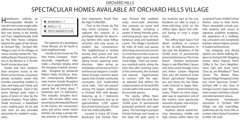 seeking an incomparable lifestyle in one of irvine’s most sought-after addressescandiscoverthebeautiful new homes in the amelia and Trevi neighborhoods, built by The New Home Company beyond the gates of the Groves at Orchard Hills. Orchard Hills village is part of the villages of irvine,recently namedthe “Top- Selling Master planned Community in the Western u. S.” for the fourth consecutive year.