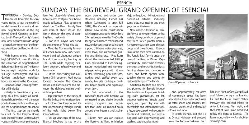 - Sunday, September 20, from 9am to 5pm, you’re invited to tour the nearly 40 model homes for about a dozen new neighborhoods at the Big reveal Grand Opening at esencia, South Orange County’s brand new view-oriented hillside village -situatedalong some of the highest elevations on rancho Mission Viejo.