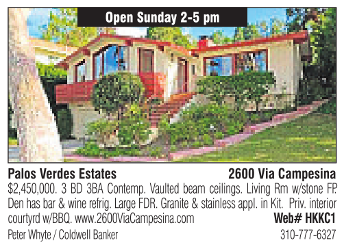 Palos Verdes Estates Open Sunday 2-5 pm 2600 Via Campesina $2,450,000. 3BD3BA Contemp. Vaulted beam ceilings. Living Rm w/stone FP. Den has bar &winerefrig. LargeFDR.Granite&stainless appl. in Kit. Priv. interior courtyrdw/BBQ.www.2600ViaCampesina.com Web# HKKC1 Peter Whyte /Coldwell Banker 310-777-6327