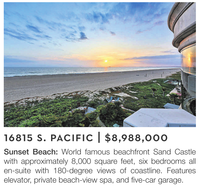 Sunset Beach: World famous beachfront Sand Castle with approximately 8,000 square feet, six bedrooms all en-suite with 180-degree views of coastline. Features elevator, private beach-view spa, and five-car garage.