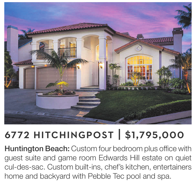 Huntington Beach: Custom four bedroom plus office with guest suite and game room Edwards Hill estate on quiet cul-des-sac. Custom built-ins, chef’s kitchen, entertainers home and backyard with Pebble Tec pool and spa.