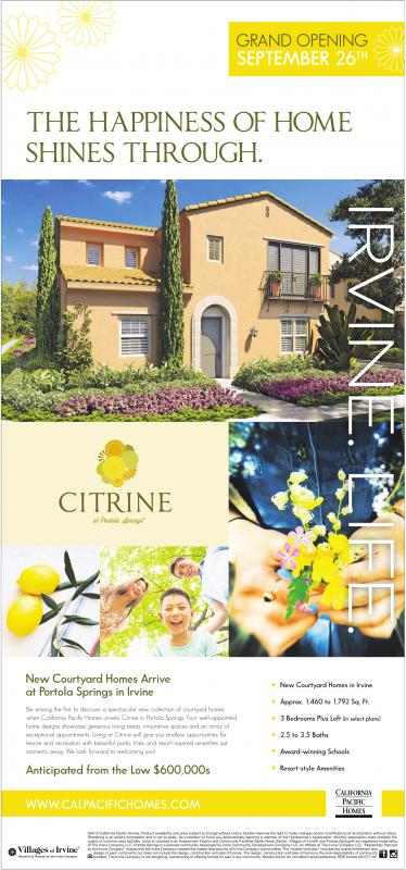 Be among the first to discover a spectacular new collection of courtyard homes when California Pacific Homes unveils Citrine in Portola Springs. Four well-appointed home designs showcase generous living areas, innovative spaces and an array of exceptional appointments. Living at Citrine will give you endless opportunities for leisure and recreation with beautiful parks, trails and resort-inspired amenities just moments away. We look forward to welcoming you!