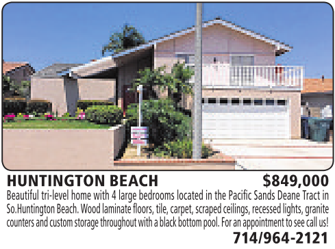 HUNTINGTON BEACH $849,000 Beautiful tri-level home with 4large bedrooms located inthe Pacific Sands Deane Tract in So.HuntingtonBeach. Wood laminate floors,tile, carpet,scraped ceilings,recessed lights,granite counters andcustom storage throughout with ablack bottom pool. For an appointmenttosee call us!