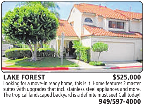 LAKE FOREST $525,000 Looking for amove-inready home,this is it.Homefeatures2master suites with upgrades that incl.stainless steelappliancesand more. Thetropical landscapedbackyard is adefinite mustsee!Calltoday!