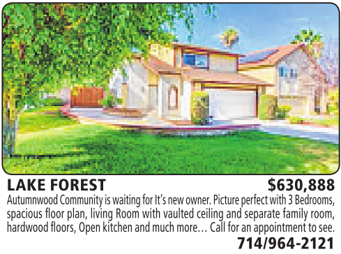 LAKE FOREST $630,888 Autumnwood Communityiswaitingfor It’s new owner.Picture perfectwith3Bedrooms, spacious floor plan, living Room with vaulted ceiling and separate family room, hardwood floors, Open kitchen and much more…Callfor an appointmenttosee. 714/964-2121