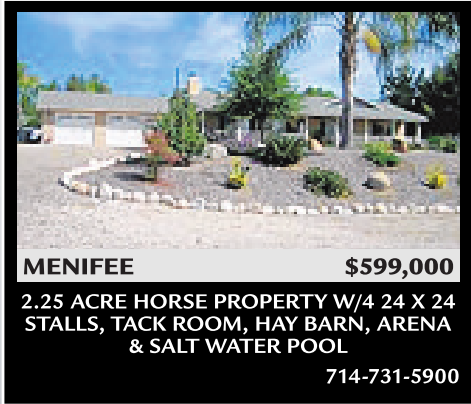 2.25 ACRE HORSE PROPERTY W/4 24 X 24 STALLS, TACK ROOM, HAY BARN, ARENA & SALT WATER POOL 714-731-5900