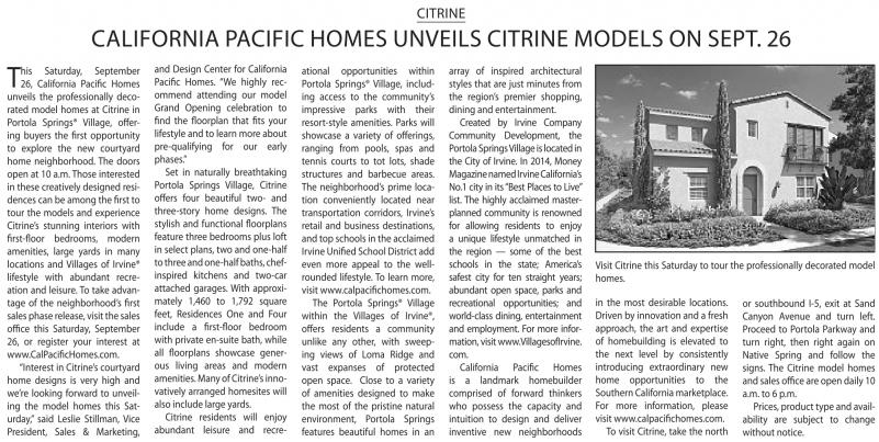 Saturday, September 26, California Pacific Homes unveils the professionally decorated model homes at Citrine in Portola Springs® Village, offering buyers the first opportunity to explore the new courtyard home neighborhood. The doors open at 10 a.m. Those interested in these creatively designed residences can be among the first to tour the models and experience Citrine’s stunning interiors with first-floor bedrooms, modern amenities, large yards in many locations and Villages of Irvine® lifestyle with abundant recreation and leisure. To take advantage of the neighborhood’s first sales phase release,visit the sales office this Saturday, September 26, or register your interest at www.CalPacificHomes.com.