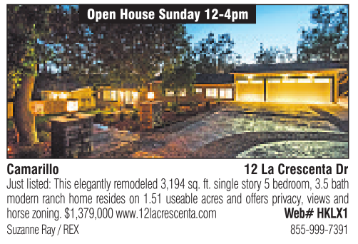 Camarillo Open House Sunday 12-4pm 12 La Crescenta Dr Just listed: This elegantly remodeled3,194 sq. ft.single story 5bedroom, 3.5 bath modern ranch home resides on 1.51 useable acres and offers privacy, views and horse zoning. $1,379,000 www.12lacrescenta.com Web# HKLX1 Suzanne Ray /REX 855-999-7391