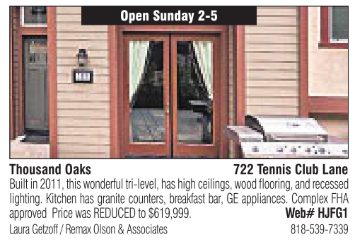 Thousand Oaks Open Sunday 2-5 722 Tennis Club Lane Built in 2011, thiswonderful tri-level,has high ceilings, wood flooring,and recessed lighting.Kitchen has granite counters, breakfast bar,GEappliances. Complex FHA approved Price was REDUCEDto$619,999. Web# HJFG1 Laura Getzoff /Remax Olson &Associates 818-539-7339