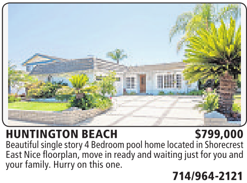 HUNTINGTON BEACH $799,000 Beautifulsinglestory4Bedroompoolhomelocated in Shorecrest East Nice floorplan, move in readyand waitingjust for youand your family. Hurryonthis one.