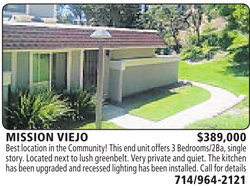 story. Located next to lush greenbelt.Veryprivate andquiet. Thekitchen hasbeen upgraded andrecessed lighting hasbeeninstalled. Call for details 714/964-2121