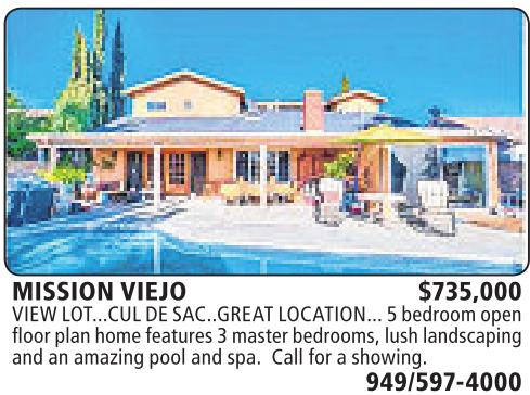 MISSION VIEJO $735,000 VIEW LOT...CULDESAC..GREATLOCATION... 5bedroom open floor plan home features3masterbedrooms,lushlandscaping and an amazingpooland spa. Call for ashowing.