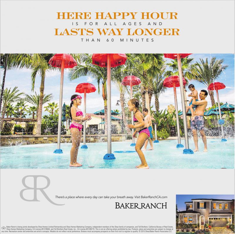 BakerRanch is being jointlydeveloped by Shea Homes Limited Partnership and Shea HomesMarketingCompany,independent members of theShea family of companies, and Toll Brothers. California Bureau of Real Estate, Shea Homes Marketing Company,CALicense#01378646,and Toll Brothers Real Estate,Inc., CA License #01206770. This is notanofferingwhere prohibited by law. Products, plans and amenities are subjecttochangeat any time. Recreationcenter andamenities are artist’sconcepts. Models do notreflectracial preference.Brokers must accompany prospects on their first visit to registertoqualify.©2015 Shea/Baker Ranch Associates LLC.