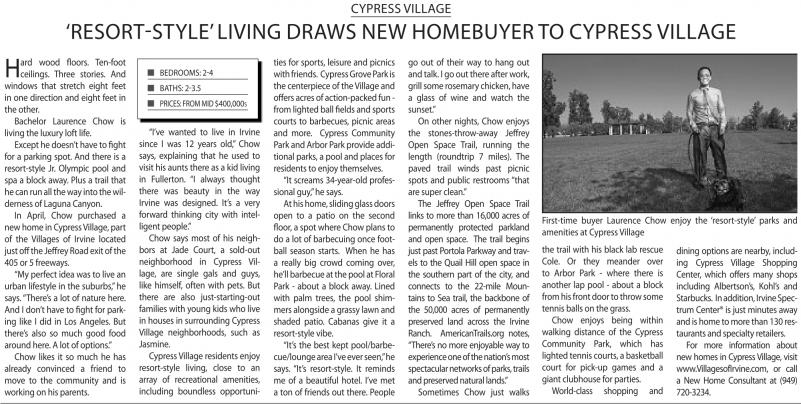 For more information about new homes in Cypress Village,visit www.VillagesofIrvine.com, or call a New home Consultant at (949) 720-3234.