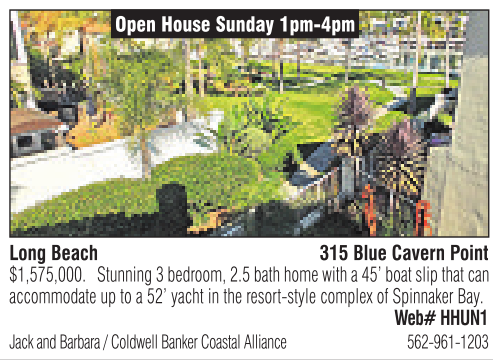 Long Beach Open House Sunday 1pm-4pm 315 Blue Cavern Point $1,575,000. Stunning 3bedroom, 2.5 bath home with a45’ boat slip that can accommodate up to a52’ yacht in the resort-style complex of Spinnaker Bay. Web# HHUN1 Jack and Barbara /Coldwell Banker Coastal Alliance 562-961-1203 See also