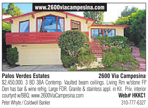 Palos Verdes Estates www.2600viacampesina.com 2600 Via Campesina Peter Whyte /Coldwell Banker 310-777-6327 $2,450,000. 3BD3BA Contemp. Vaulted beam ceilings. Living Rm w/stone FP. Den has bar &winerefrig. LargeFDR.Granite&stainless appl. in Kit. Priv. interior courtyrdw/BBQ.www.2600ViaCampesina.com Web# HKKC1