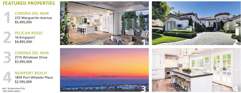 FEATURED PROPERTIES 1 2 3 4 CORONA DEL MAR 223 Marguerite Avenue $5,495,000 PELICAN RIDGE 16 Kingsport $4,895,000 CORONA DEL MAR 2715 Windover Drive $3,495,000 NEWPORT BEACH 1859 Port Wheeler Place $2,595,000 Appt. | By AppointmentOnly *SalesGallery Address See also